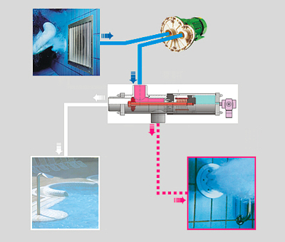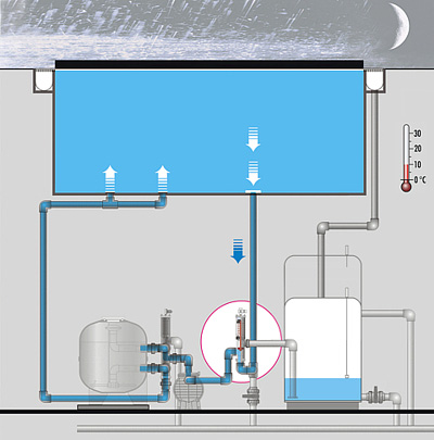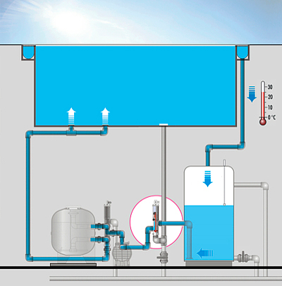 Schematické představení fungování 3-cestného BESGO ventilu s použitím jednotky AS Control Plus - voda je nasávána v závislosti na teplotě buď přes dnové sání nebo přepadový žlábek